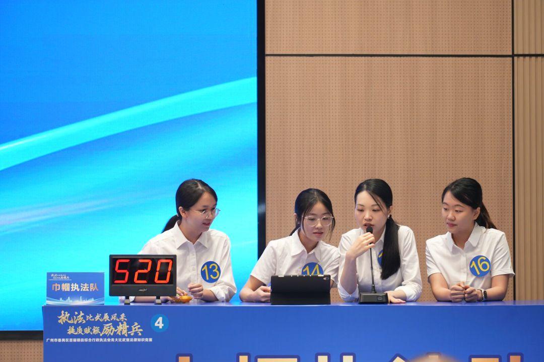 当天上午进行了大比武活动的最后一项考核——法律知识竞赛,围绕行政处罚法、行政强制法、行政复议法和行政执法“三项制度”等方面,考察参赛队员的综合法律知识储备量与熟练掌握程度。16个镇街法制审核员采取抽签的形式组成4支队伍进行对决,经过三个环节的激烈角逐,由石楼镇、沙湾街、桥南街、钟村街等4个镇街法制审核员组成的巾帼执法队夺得法律知识竞赛第一名。