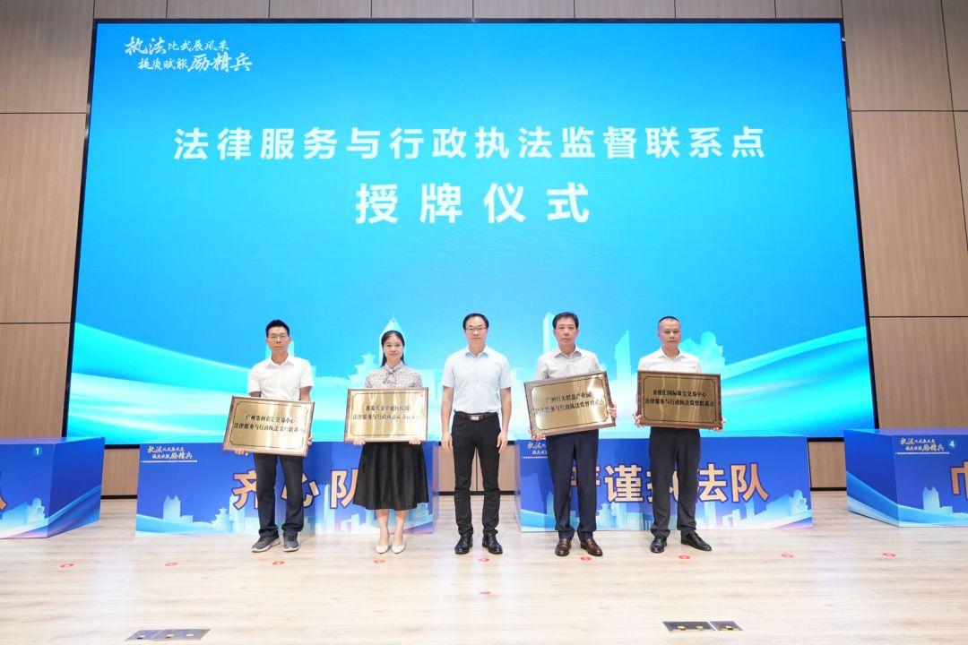 当天上午,还举行了法律服务与行政执法监督联系点授牌仪式,广州巨大创意产业园、番禺节能科技园、广州集利彩宝交易中心、金俊汇国际珠宝交易中心4个产业园区成为番禺区首批法律服务与行政执法监督联系点。联系点的建立,为番禺区改进行政执法方式,持续提升行政执法水平,促进严格规范公正文明执法提供有力支撑。