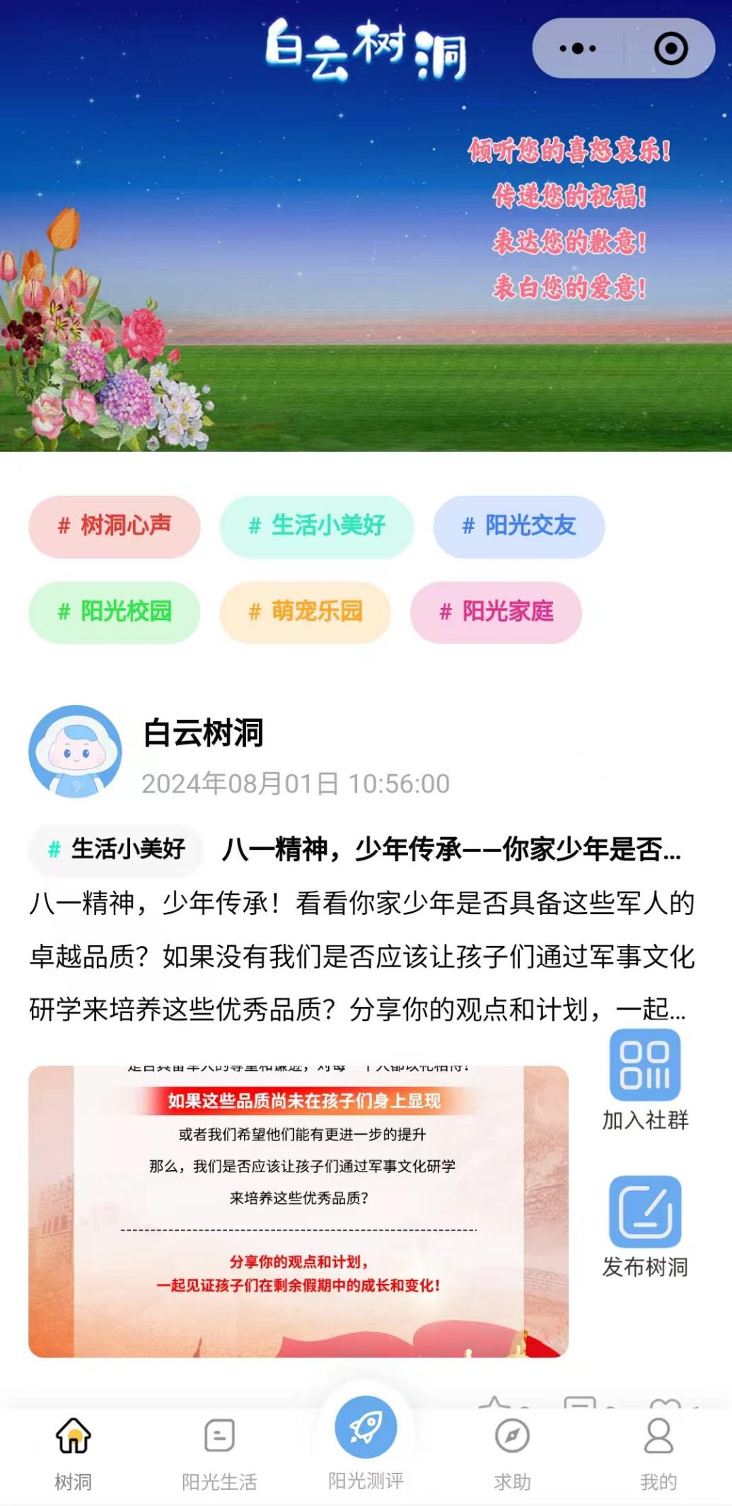 白云树洞是居民群众心声交流、表达情感、心理咨询的数字平台,开展时节热点话题活动与居民群众一起表达喜怒哀乐、传递祝福、表达歉意、表白爱意,同时链接了心理求助、心理测评、阳光生活宝典等服务,实现初级心理疏导。