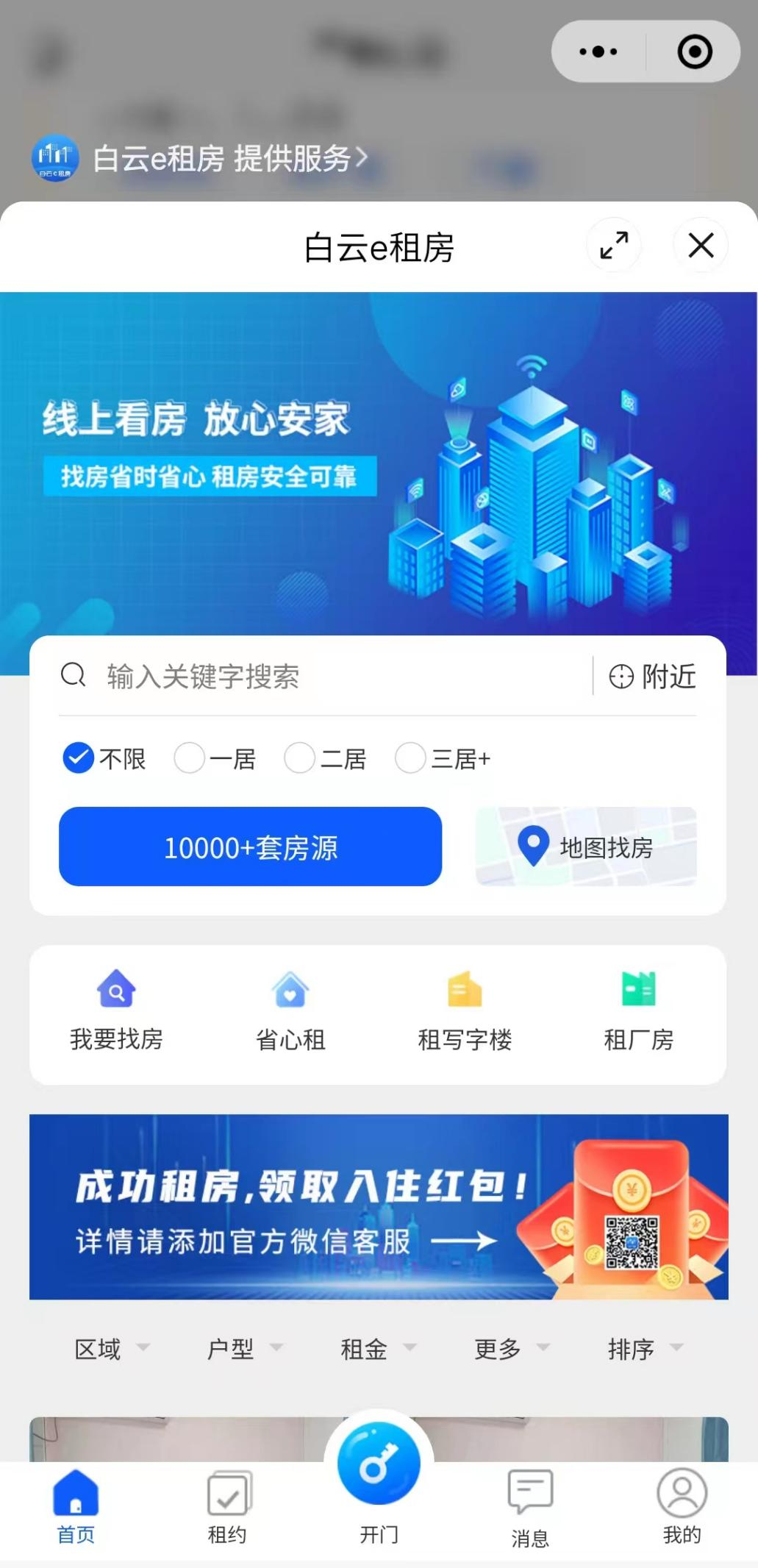 白云区出租屋租赁平台(白云e租房)是白云区出租屋租赁管理与服务信息化平台,面向出租人提供一站式房源上架放租、催缴租金、账单管理等服务功能和“人屋”信息、物业管理等功能;面向租客提供线上找房、看房预约、电子合同签订等服务。