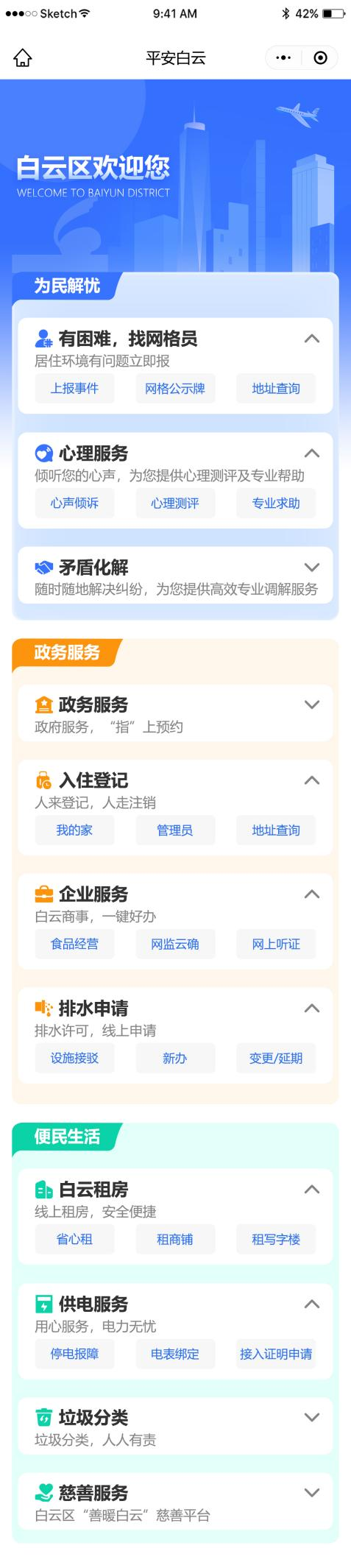 用手机扫一扫“白云码”,即进入“平安白云”小程序首页。只见“为民解忧”“政务服务”“便民生活”三大板块用不同色系区分,清晰明了。居民群众只需点击所需服务,即可一键进入对应的服务小程序。