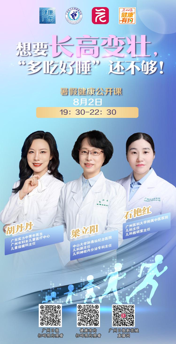 针对家长们最关心的暑假健康话题,从7月31日起至8月15日,在广东省卫生健康委员会、广州市卫生健康委员会的指导下,广州日报健康有约将联合广州各医院推出“2024暑假健康公开课”系列微课,分别聚焦孩子的生长发育、脊柱健康、护眼配镜、护齿正畸等话题。第二场微课聚焦生长发育话题,将于8月2日晚7:30至10:30上线。