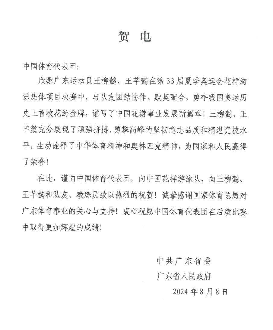 北京时间8月8日凌晨,广东运动员王柳懿、王芊懿在巴黎奥运会花样游泳集体项目决赛中,与队友获得中国奥运历史首枚花游金牌。广东省委、省政府向中国体育代表团致贺电,全文如下: