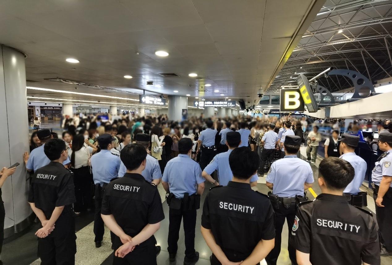 今年6月,首都国际机场二号航站楼6号门附近,有大量粉丝聚集。现场人数最多的时候超过700人,对旅客出行造成较大影响。首都机场公安局多方协调,联合机场多部门开展工作,对拥挤人群进行疏导,幸未发生粉丝拥挤踩踏及违法扰序等情况。