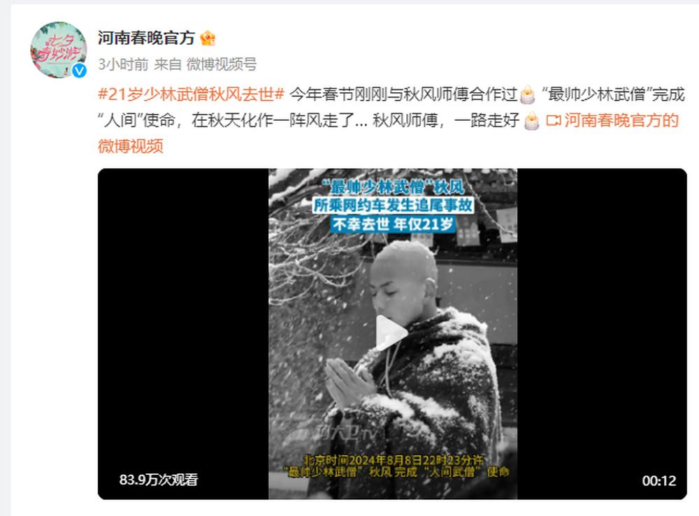 @河南春晚官方 发文:今年春节刚刚与秋风师傅合作过,“最帅少林武僧”完成“人间”使命,在秋天化作一阵风走了… 秋风师傅,一路走好。