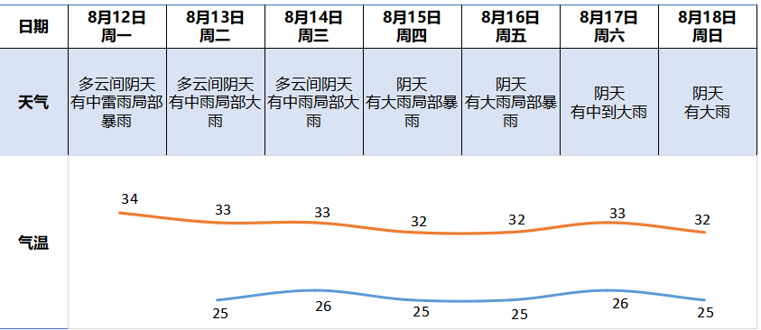 8月12日,广州市三防总指挥部办公室与市气象局、广东省水文局广州水文分局和自然资源部南海预报减灾中心对广州市未来七天的气象水文情况进行了会商。会商结论意见指出,8月12日,多云间阴天,有中雷雨局部暴雨(午后为主),并伴有短时大风、强雷电、短时强降水等强对流天气,高温天气缓解;13至18日,受低涡切变和季风影响,有中到大雨局部暴雨。