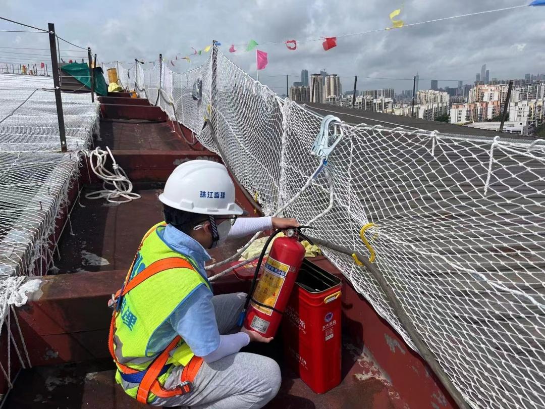 针对屋面施工的高空作业,监理尤其关注安全细节,从安全绳是否牢固、到安全兜底网是否结实、再到辅助的钢丝绳质量,全部都要逐一检查。监理特别要求,高空作业前不能喝酒,现场设有酒精测试仪。如果体检报告显示工人有心脏等相关疾病,同样不允许施工。