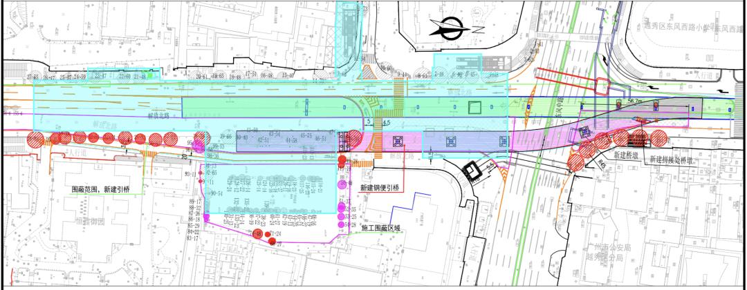 解放北路高架是市中心南北向重要交通干道,如何减少施工期间对市民出行的影响?根据交通疏解方案,项目先在车站基坑东侧新建临时钢便桥,其后拆除现状高架桥6跨共180米长。钢便桥与现状高架一样为三车道设计,保障南北向交通。车站建成后复建高架,拆除临时钢便桥。