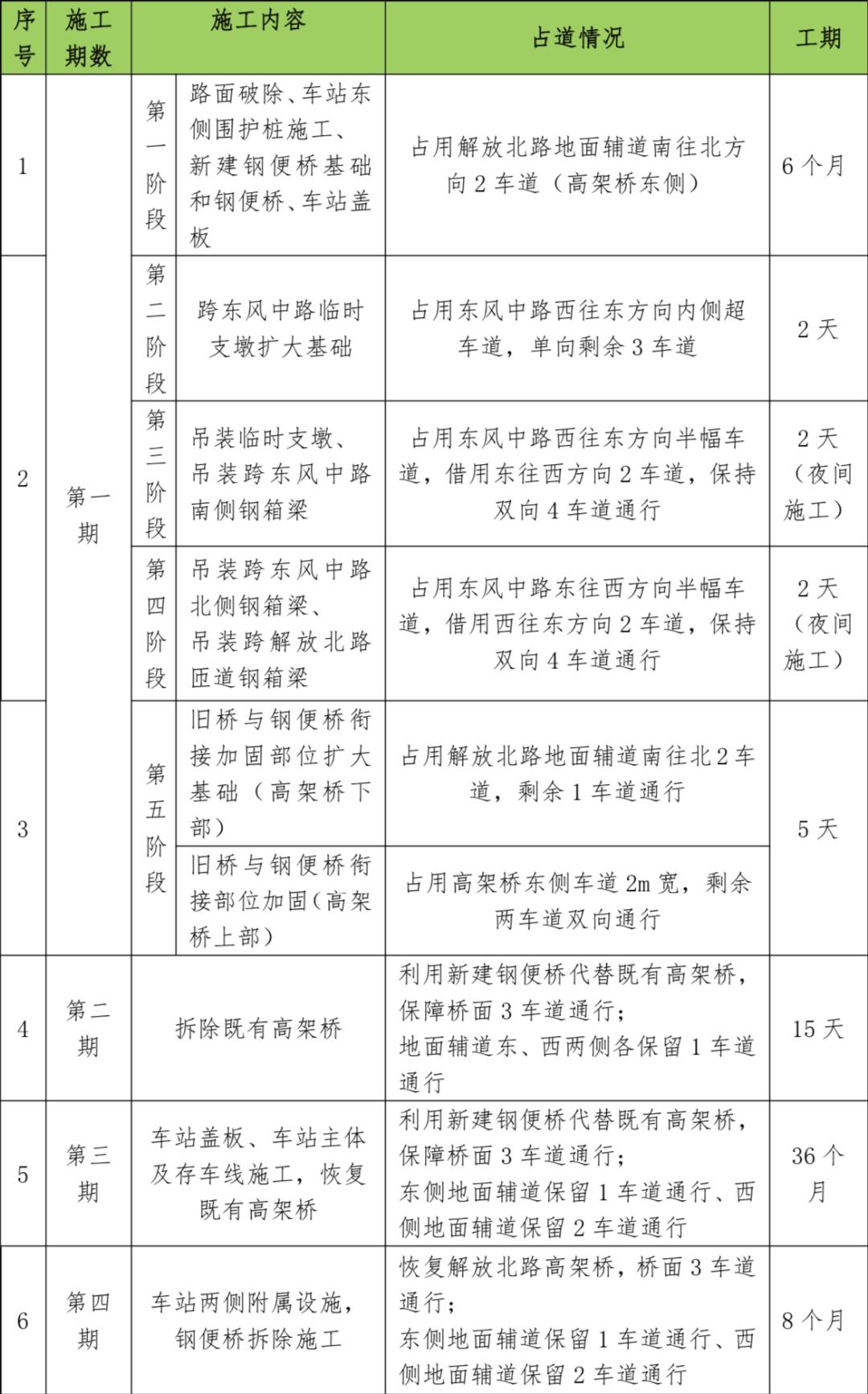 施工计划显示,工程分四期施工,总计逾50个月。其中,路面破除、新建钢便桥等约6个月,拆除现状高架桥约15天,车站施工、复建高架桥等约36个月,车站附属设施,钢便桥拆除施工等约8个月。