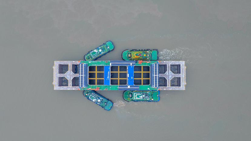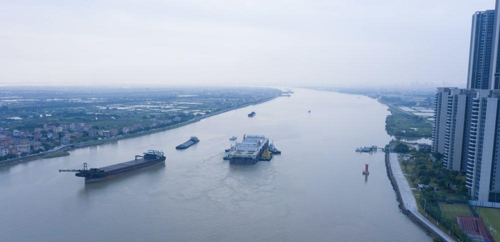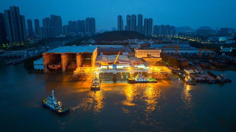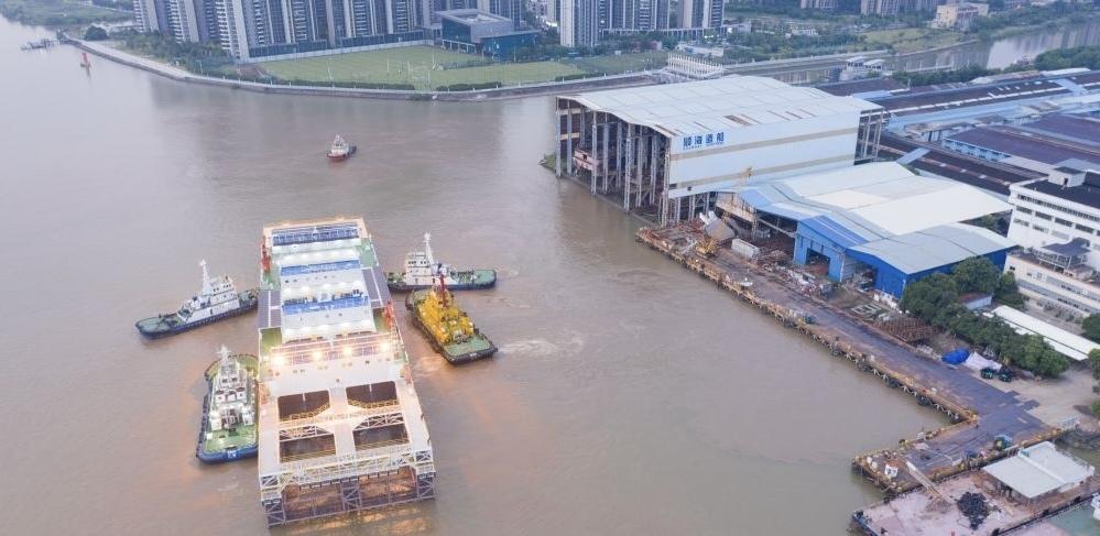 夜间5时许,四艘大马力拖轮到达顺海造船码头,顺海造船工人为“鑫环1号”起锚,两艘拖轮调试好位置,将“鑫环1号”从码头拖到莲花山水道浮莲岗水域中央。随后,另两艘拖轮来到“鑫环1号”另一侧,在四艘拖轮的保驾护航下,“鑫环1号”驶向狮子洋,向着海南省东方市海域前行。