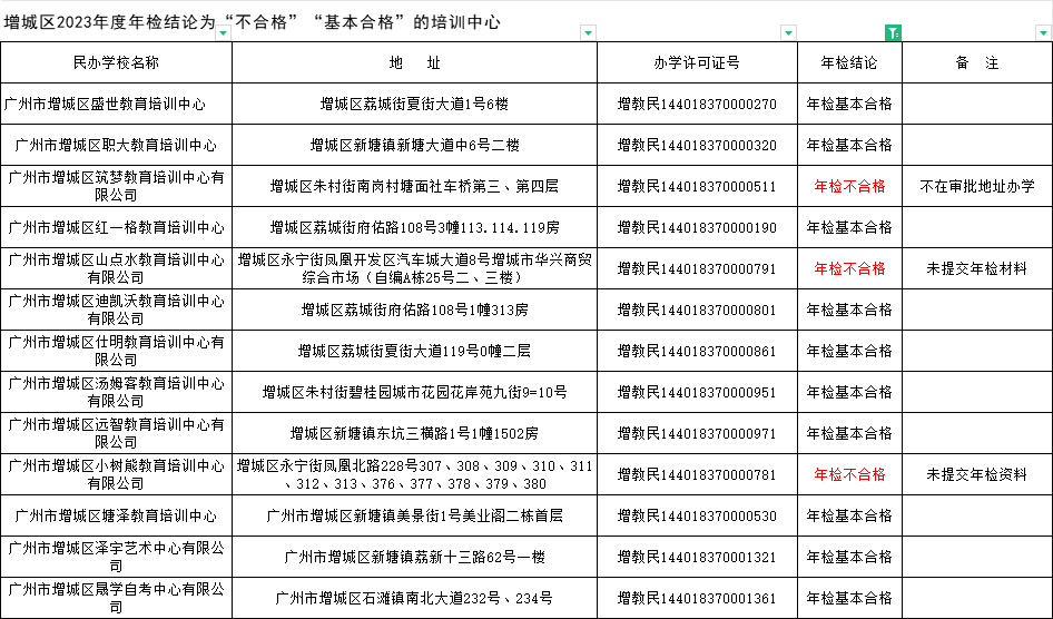 此外,增城区有3所培训中心年检结果为不合格,包括:增城区筑梦教育培训中心有限公司(不在审批地址办学)、增城区山点水教育培训中心有限公司(未提交年检材料)、增城区小树熊教育培训中心有限公司(未提交年检资料)。