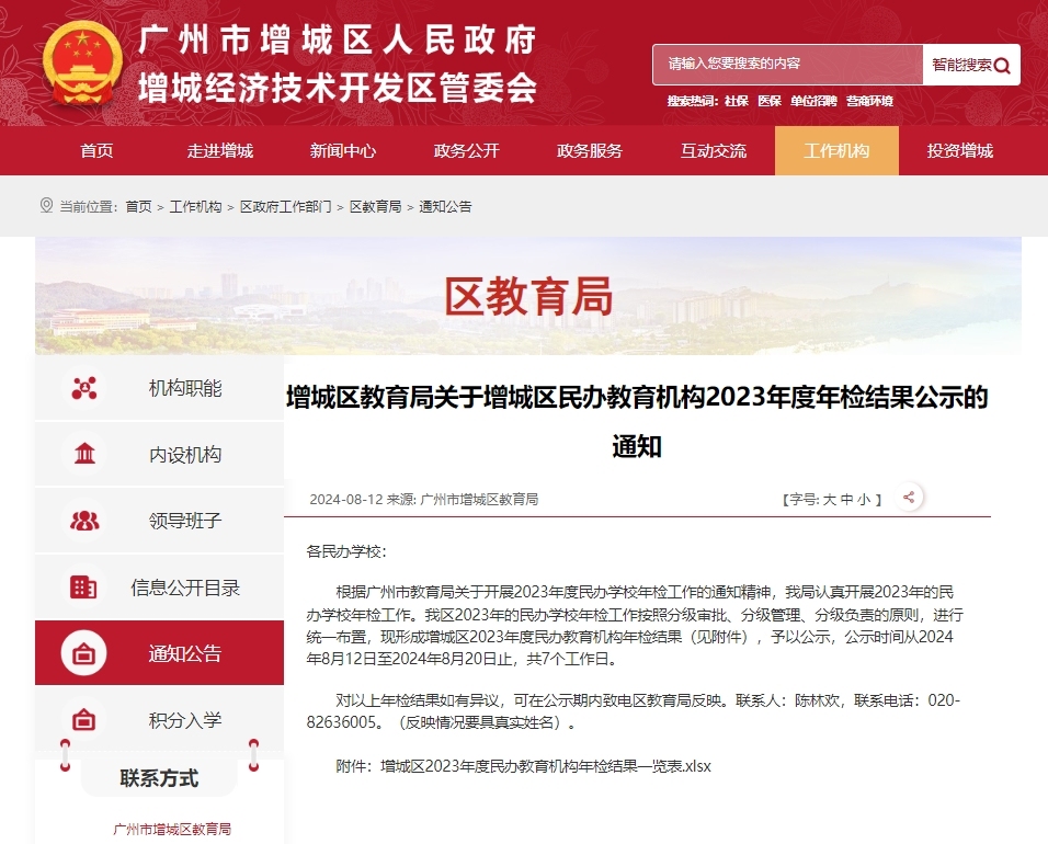 增城区教育局在通知中表示,该区2023年的民办学校年检工作按照分级审批、分级管理、分级负责的原则进行统一布置。年检结果公示时间为8月12日至8月20日。如公众对年检结果有异议,可在公示期内向增城区教育局反映。