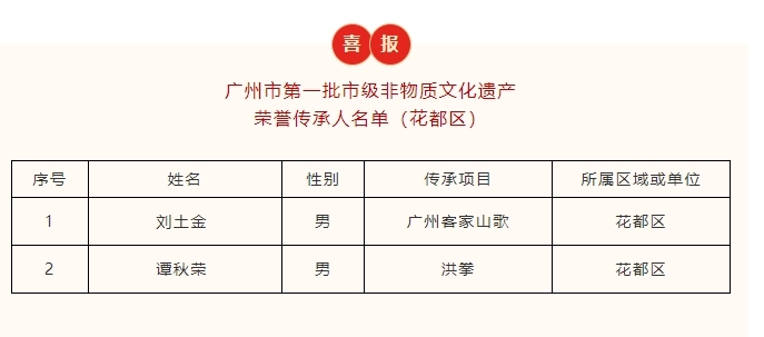 为进一步加强广州市非物质文化遗产代表性传承人动态管理,提升非物质文化遗产传承活力,广州市文化广电旅游局组织开展市级非物质文化遗产荣誉传承人推荐申报工作。日前,经自主申报、各区推荐、专家组评审、社会公示等程序,现认定10位市级代表性传承人为第一批市级非物质文化遗产荣誉传承人,花都区市级非遗代表性传承人刘土金、谭秋荣入选。