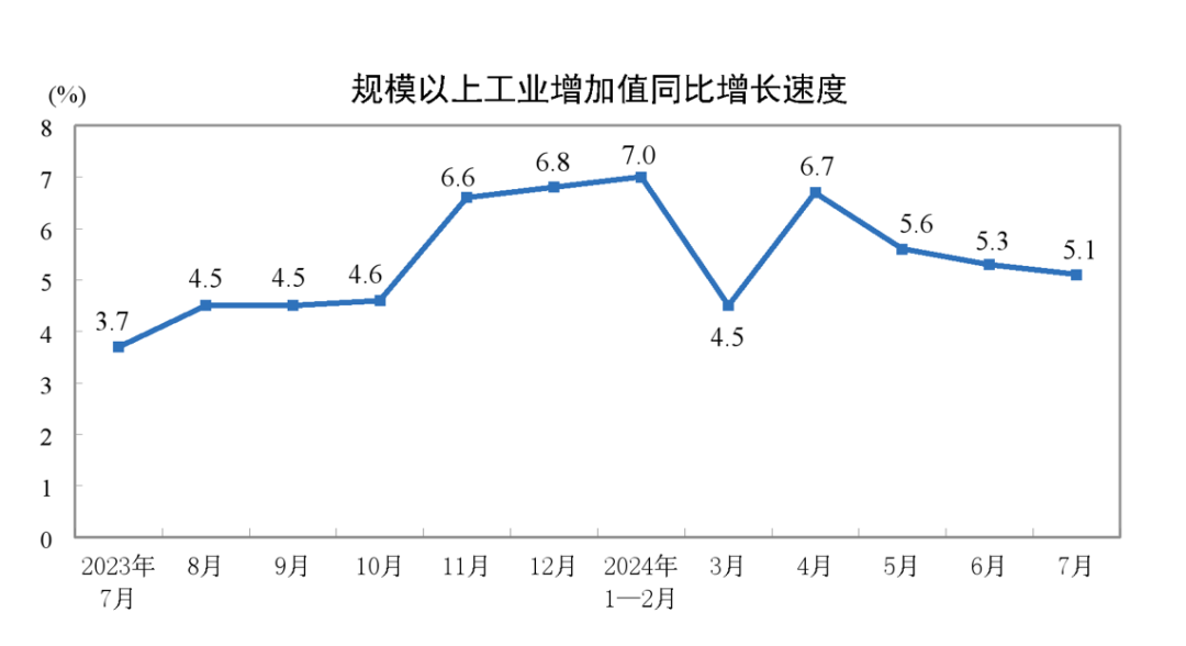 数据显示,7月份,全国规模以上工业增加值同比增长5.1%。装备制造业继续发挥“压舱石”作用,增加值同比增长7.3%。值得一提的是,企业预期保持比较乐观的状态,7月份PMI中企业生产指数是50.1%,企业生产经营活动预期指数是53.1%,继续处于扩张区间。