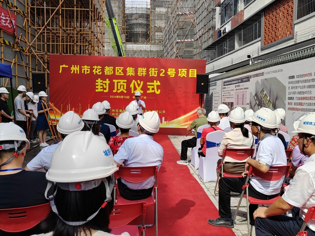 8月16日,广州北站东南侧的花都新华市场人头熙攘,一如既往。集群街2号项目施工现场,起重机的机械臂划过老城区的烟火气,伴随着机器的轰鸣声,重建中的新集群街2号楼完成屋面结构施工,主体结构比原施工计划提前6天顺利封顶。