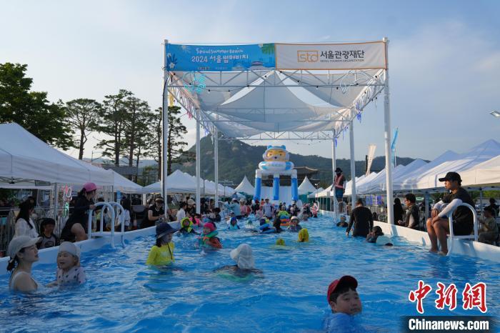8月7日晚间,首尔市民在光化门广场玩水解暑。中新社记者 刘旭 摄