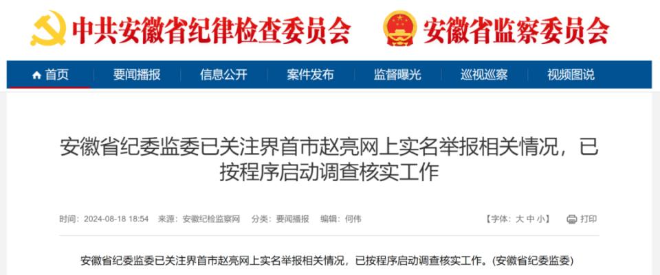 安徽纪检监察微信号8月18日消息,安徽省纪委监委已关注界首市赵亮网上实名举报相关情况,已按程序启动调查核实工作。