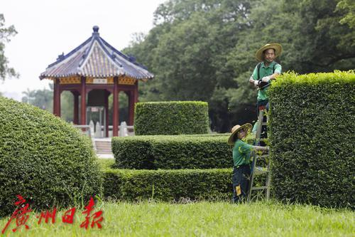 中山大学南校园惺亭前,绿化工在修剪草木。