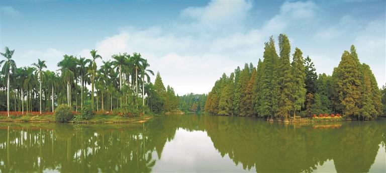 一边是四季常绿的棕榈植物,椰风葵林一派热带风情;另一边是依水而生的落羽杉,春来嫩绿,入夏青葱,秋时棕红,冬来飘落。1986年,华南植物园这一最具代表性的景点龙洞琪林入选羊城八景,一时传为佳话。如今的华南国家植物园四时不同,成了永不落幕的“万国奇树博览会”。中外植物荟萃于此,也呈现了广州开放包容的气质。
