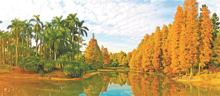 百年前,陈焕镛院士交换得来的落羽杉已成为华南国家植物园冬日的主角。元旦前后,随着冷空气南袭,落羽杉开始“换装”。阳光洒落下,落羽杉叶片变成黄色、红色,如羽毛般随风轻盈飘逸,迎接岁月轮回。游人们穿梭于湖畔的落羽杉林,领略“霜叶红于二月花”,只见水天一色,就像冬日的童话。