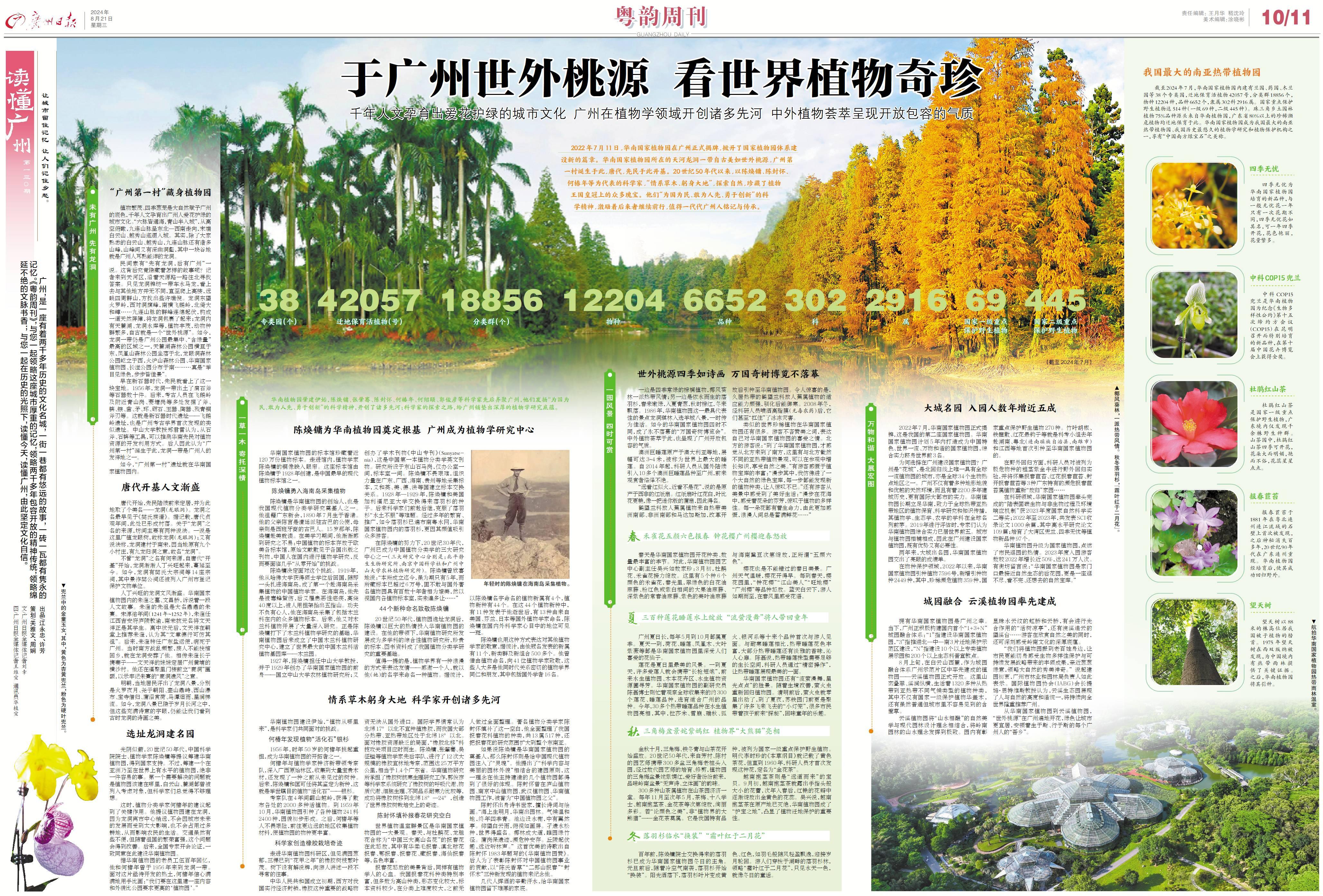 2022年7月11日,华南国家植物园在广州正式揭牌,掀开了国家植物园体系建设新的篇章。华南国家植物园所在的天河龙洞一带自古美如世外桃源,广州第一村诞生于此,唐代,先民于此开基。20世纪50年代以来,以陈焕镛、陈封怀、何椿年等为代表的科学家,“情系草木、躬身大地”,探索自然,珍藏了植物王国皇冠上的众多瑰宝。他们“为国为民、敢为人先、勇于创新”的科学精神,激励着后来者继续前行,值得一代代广州人铭记与传承。