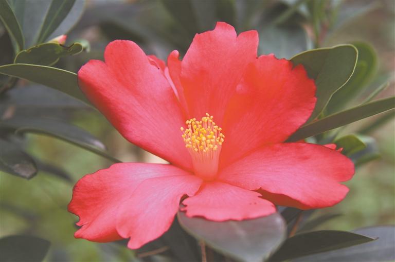杜鹃红山茶是国家一级重点保护野生植物,广东境内仅发现千余株野生种群。山茶园中,杜鹃红山茶四季可开花,花朵大而明媚,艳而不俗,花蕊星星点点。
