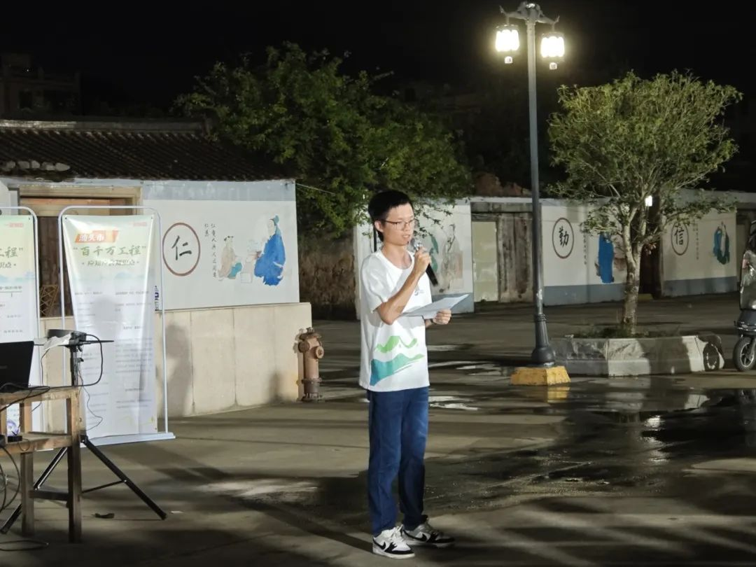 活动期间,项目团队负责人黄锐举同学代表项目团队为现场群众简要介绍了“百千万工程”提出的背景情况以及项目团队成立两年来所取得的成效。团队成员还为村民朋友详细介绍了“百千万工程”的核心内容及其价值,同时列举了大学生突击队在河溪镇的“百千万工程”案例,让更多村民了解和认识“百千万工程”。