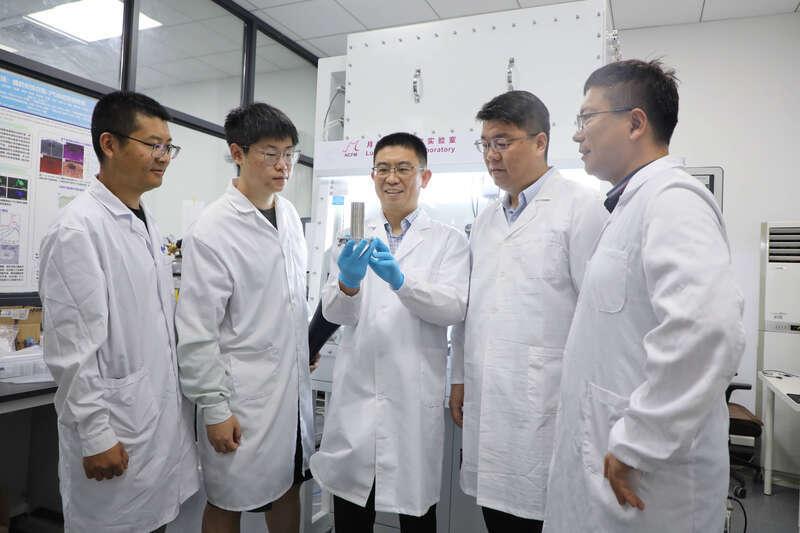科研人员使用透射电子显微镜观察月壤中“铁-水蒸气泡”伴生现象(前左博士生陈霄、前右陈国新博士、后左许巍副研究员、后中霍军涛研究员、后右王军强研究员)。中国科学院宁波材料技术与工程研究所供图