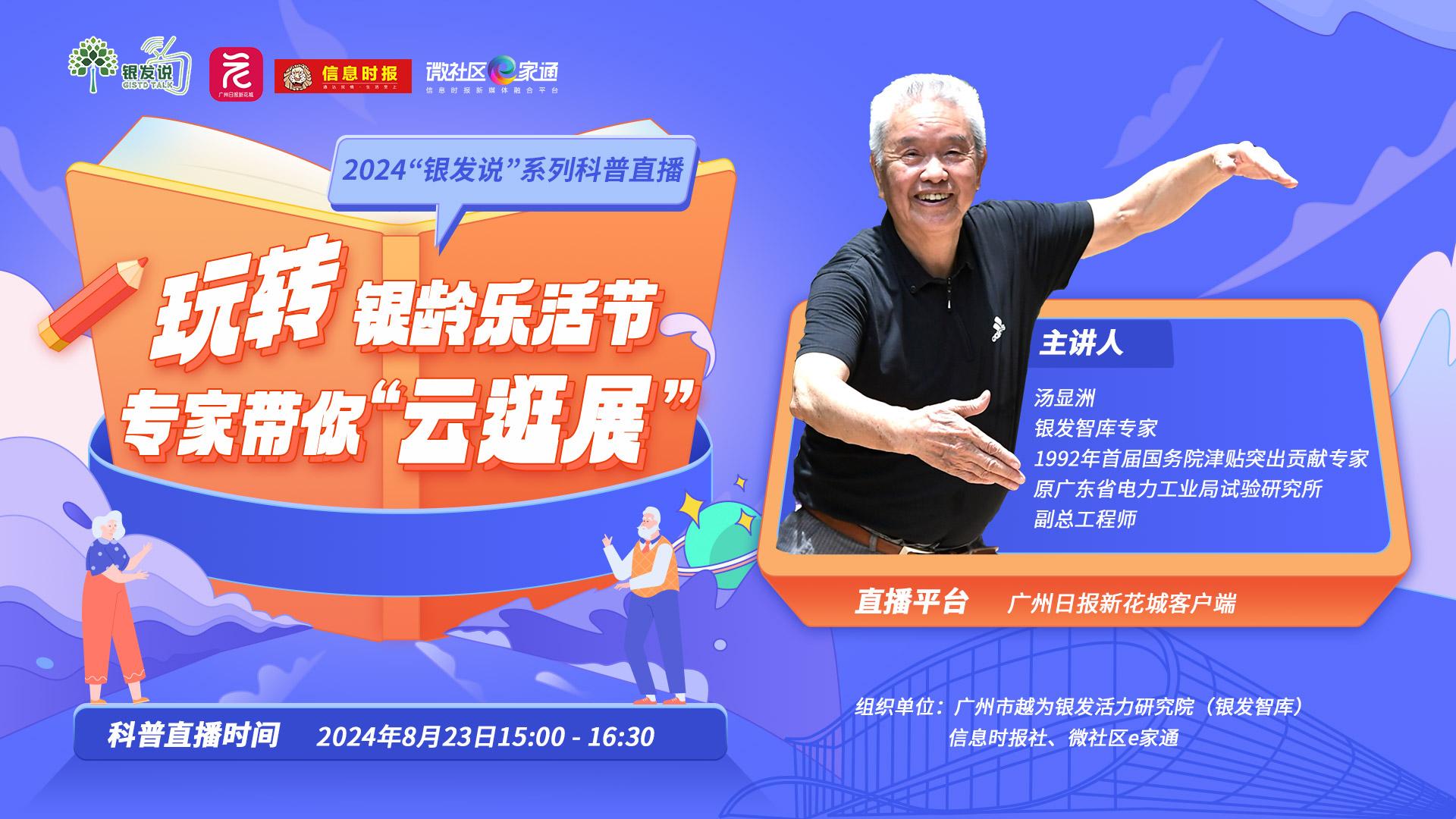 精彩银龄,缤纷乐活!8月23日下午,“银发说”走进广州老博会银龄乐活节,足不出户带你“云逛展”!众多养老健康品牌云集,1条网红打卡街,3个银发乐活主题赛事,11个银龄主题坊一起来探索!活动将在广州日报新花城客户端全程同步直播,带你沉浸式线上逛展,让你“有看头”“有玩头”!