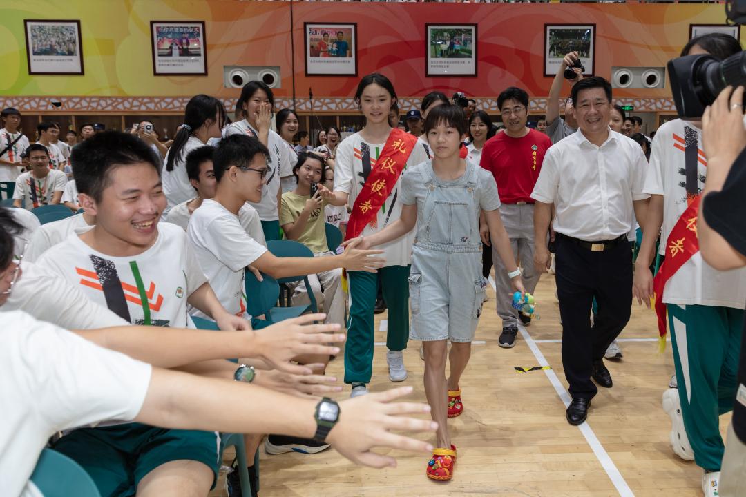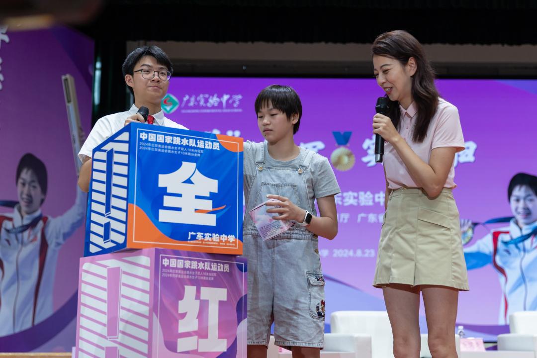 8月23日上午,奥运会跳水冠军全红婵及其教练何威仪,时隔三年再次来到广东实验中学(荔湾校区)体育馆,与同学们交流互动,共话成长,同筑梦想。广东实验中学党委书记全汉炎,校长蔡骘参加了活动。