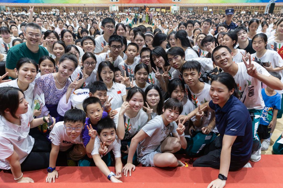 互动交流之后,全红婵还亲自带领同学们学习水花消失术的手部动作要领。现场同学们积极参与,跟随着全红婵的示范,一起享受运动的乐趣。