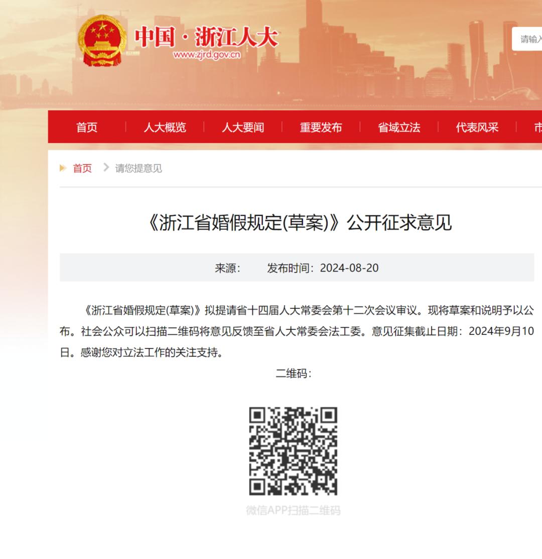 8月20日,浙江省人大在官网对外公布《浙江省婚假规定(草案)》(下称草案)全网,并公开征求意见。