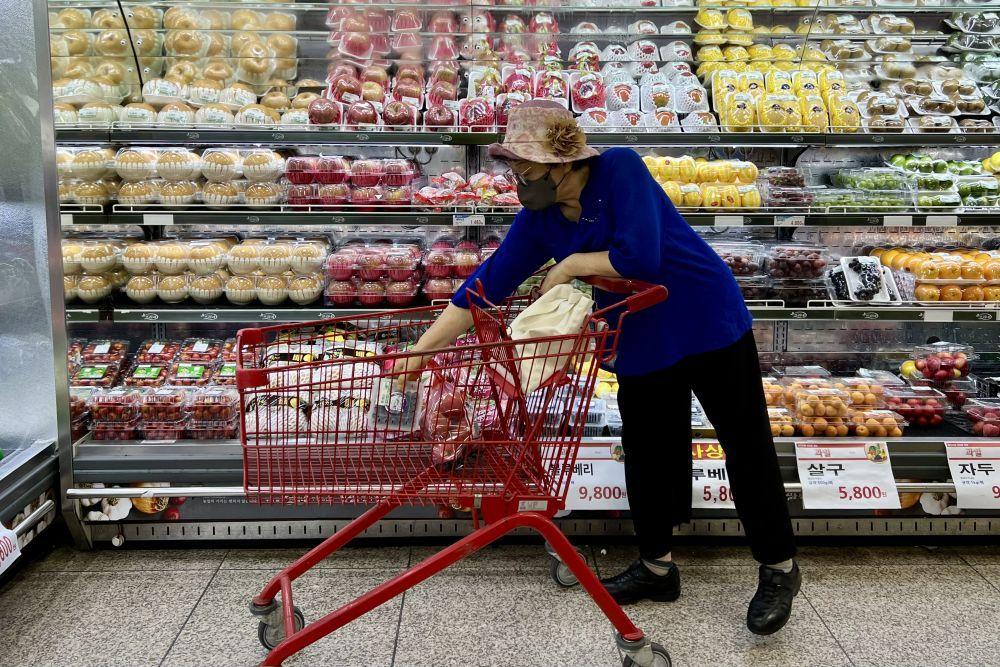 2022年7月5日,韩国首尔市民在一家超市购物。新华社记者王益亮摄