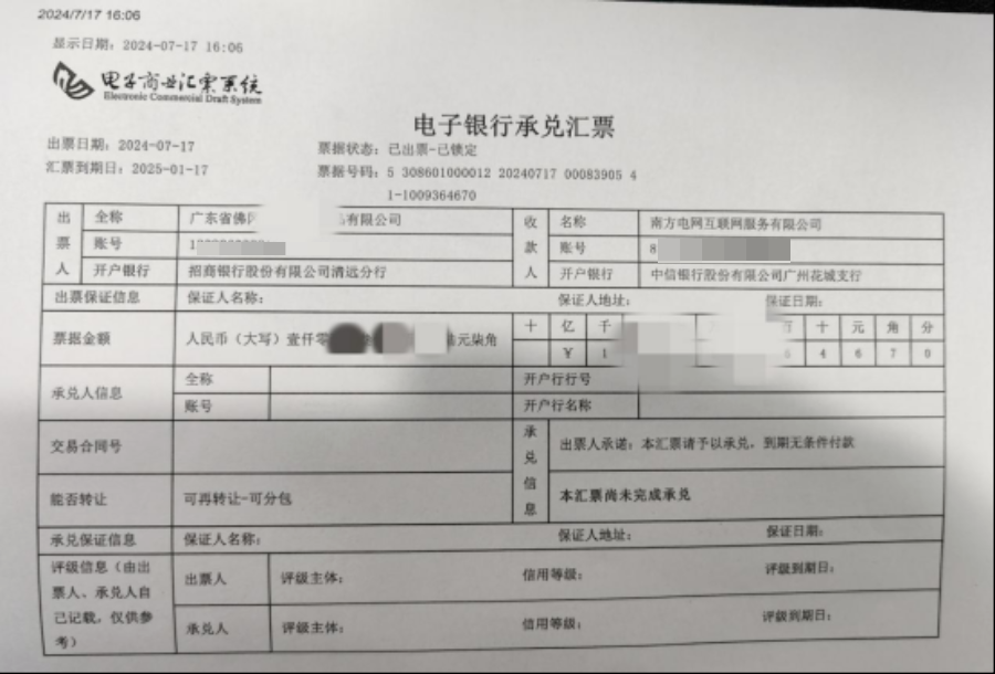 “用银行承兑汇票缴纳电费不仅省心省力还省钱啊!”广东省佛冈金城金属制品有限公司相关负责人表示,“企业只要向银行开户后申请授信,办理好银行承兑汇票就可以用于缴交南方电网当期电费,全程线上操作且一对一指导,十分简单方便。”