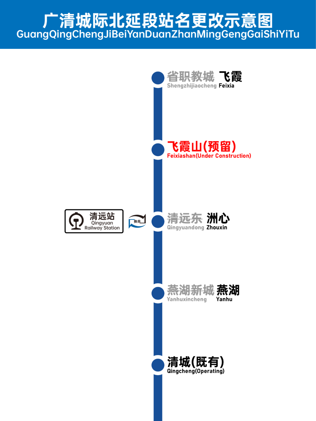 根据最新名称,广清城际北延项目起点为清城站,沿途设燕湖站、洲心站、飞霞山站(预留),终点为飞霞站,线路总长度19.7公里,全段新建车站3座,其中路中高架站2座,半地下站1座。