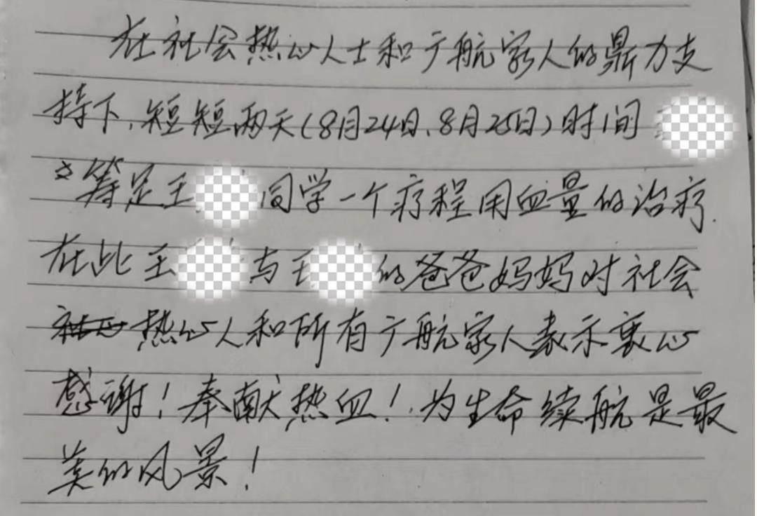 “奉献热血,为生命续航是最美的风景!”8月27日,王同学一家特意向学校发来感谢信,并向社会告知:经过短短两天时间,已筹足王同学第一个疗程用血。