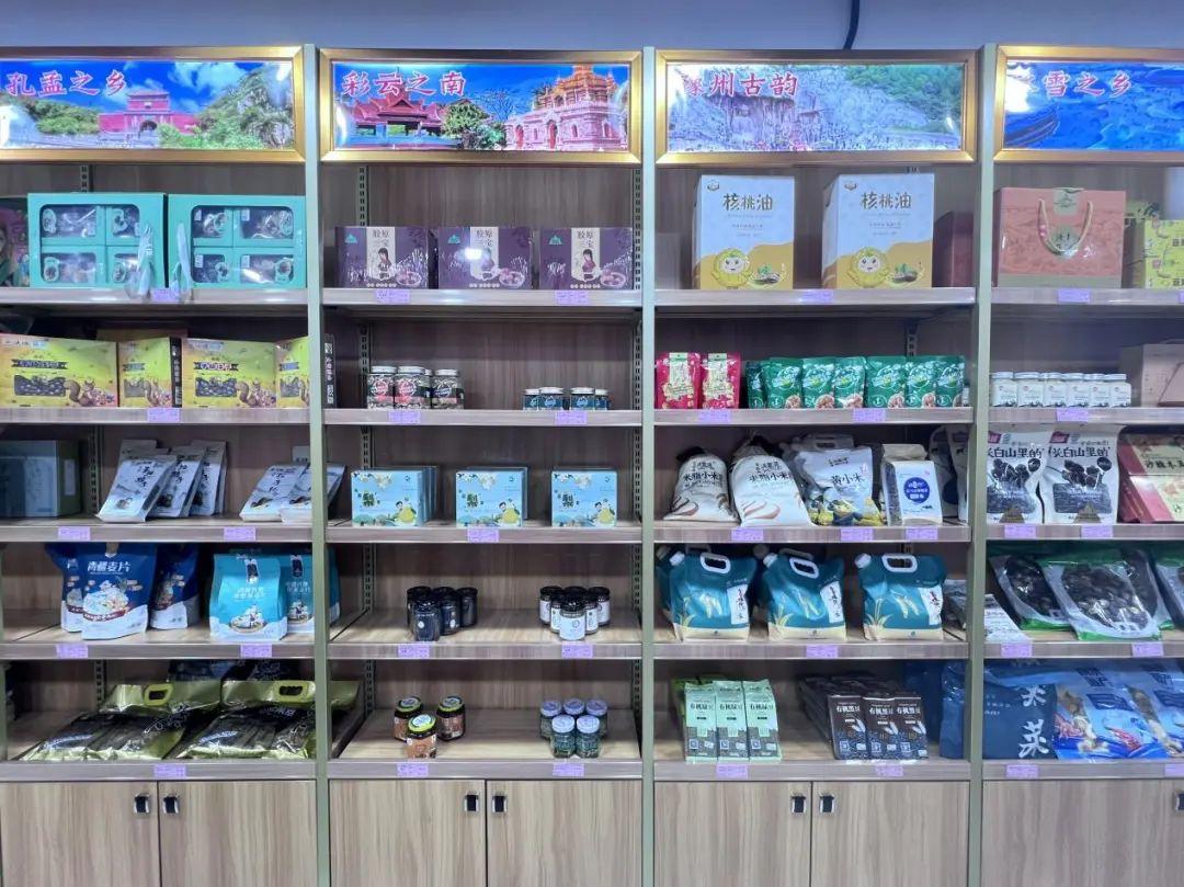 门店内,进门就能看见两排特色木制货架,货架上有内蒙古的牛腱子,贵州毕节的刺梨果糕、纯牛奶,新疆的核桃、风干牛肉、喀什有机红枣等,也有本土特色排粉、沙湾姜埋奶、沙湾牛奶饼、花生油等特产。