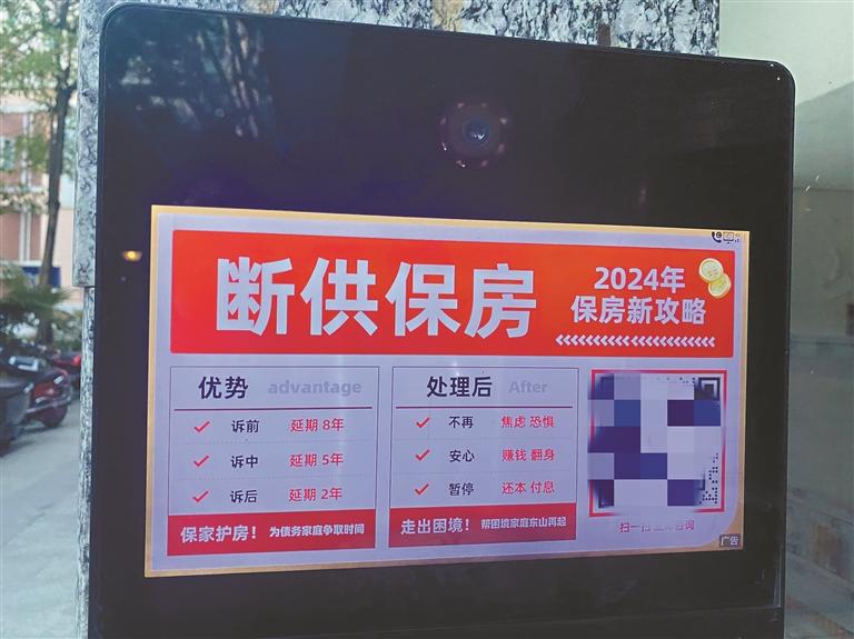“断供保房”“诉前延期8年、诉中延期5年、诉后延期2年”……近日,在广东中山某小区楼下的电子广告牌上,有关“断供保房”的广告突然“霸屏”了。