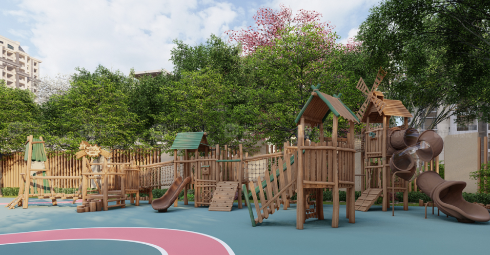户外活动区域设有篮球场、足球场、大型器械游戏区、攀爬运动区、趣味沙水区、种植园等,为孩子们提供广阔的运动、游戏及自然探索空间。