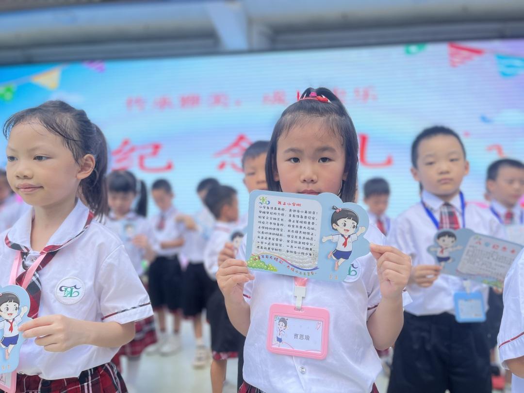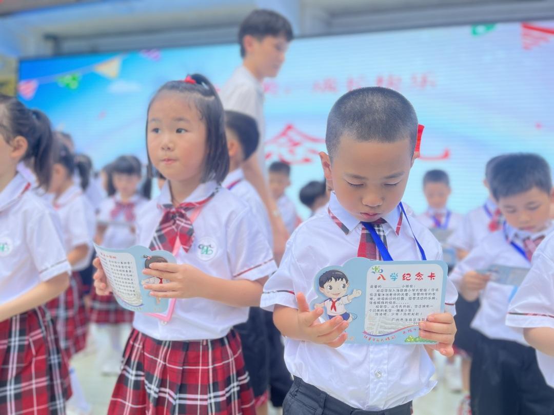 在“传承礼”环节,二至六年级的哥哥姐姐将对应的班牌,递给低一个年级的弟弟妹妹,作为一种“传承”,并鼓励学弟学妹“快乐学习”。一年级的新生们收获了学校颁发的个性化纪念卡,纪念卡上写有成长寄语。据介绍,学校以“雅美教育”为办学特色,致力于培养“雅言美行、雅量美德、健康快乐”的雅美学子。