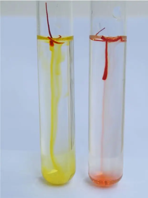 正品藏红花为暗红色,上部较宽而略扁平,下端有时残留一小段黄色花柱,体轻,质松软,质脆易断。入水可见一条棕色直线迅速下沉,逐渐扩散成黄色。