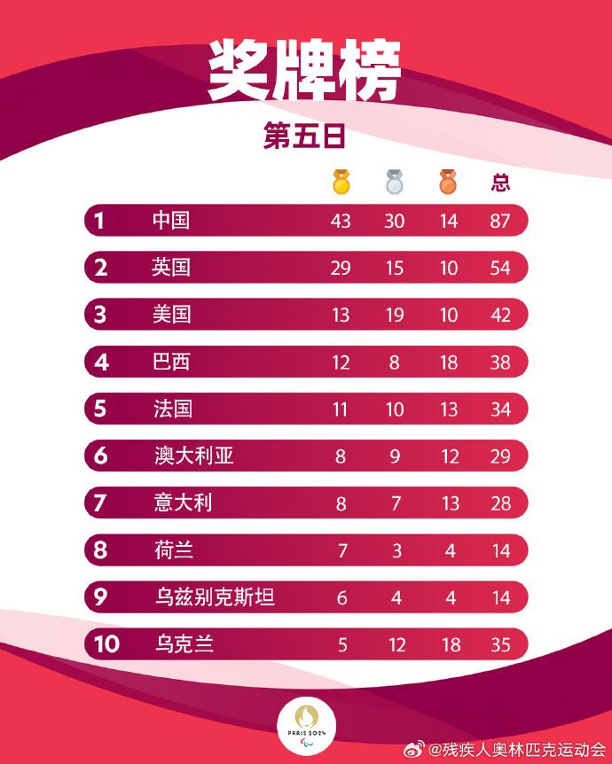 至此,巴黎残奥会赛程过半,中国代表团以43金、30银、14铜,总计87枚奖牌,继续领跑奖牌榜,英国(29金)、美国(13金)、巴西(12金)、法国(11金)位居2-5位。