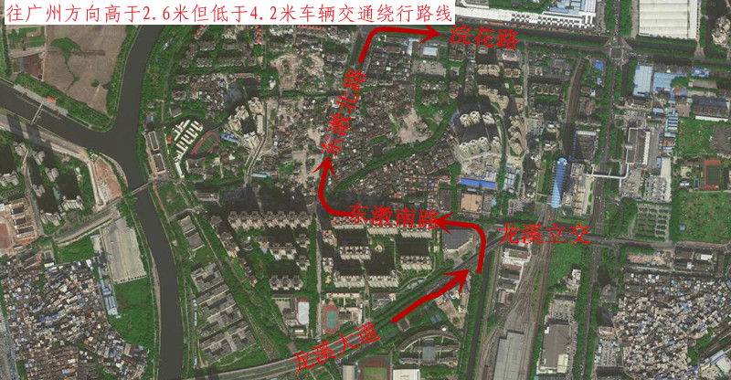 (二)高于2.6米但低于4.2米的车辆可经龙溪立交桥下右侧辅道左转下穿龙溪立交,先后途经东漖南路,东漖北路至浣花路通行;