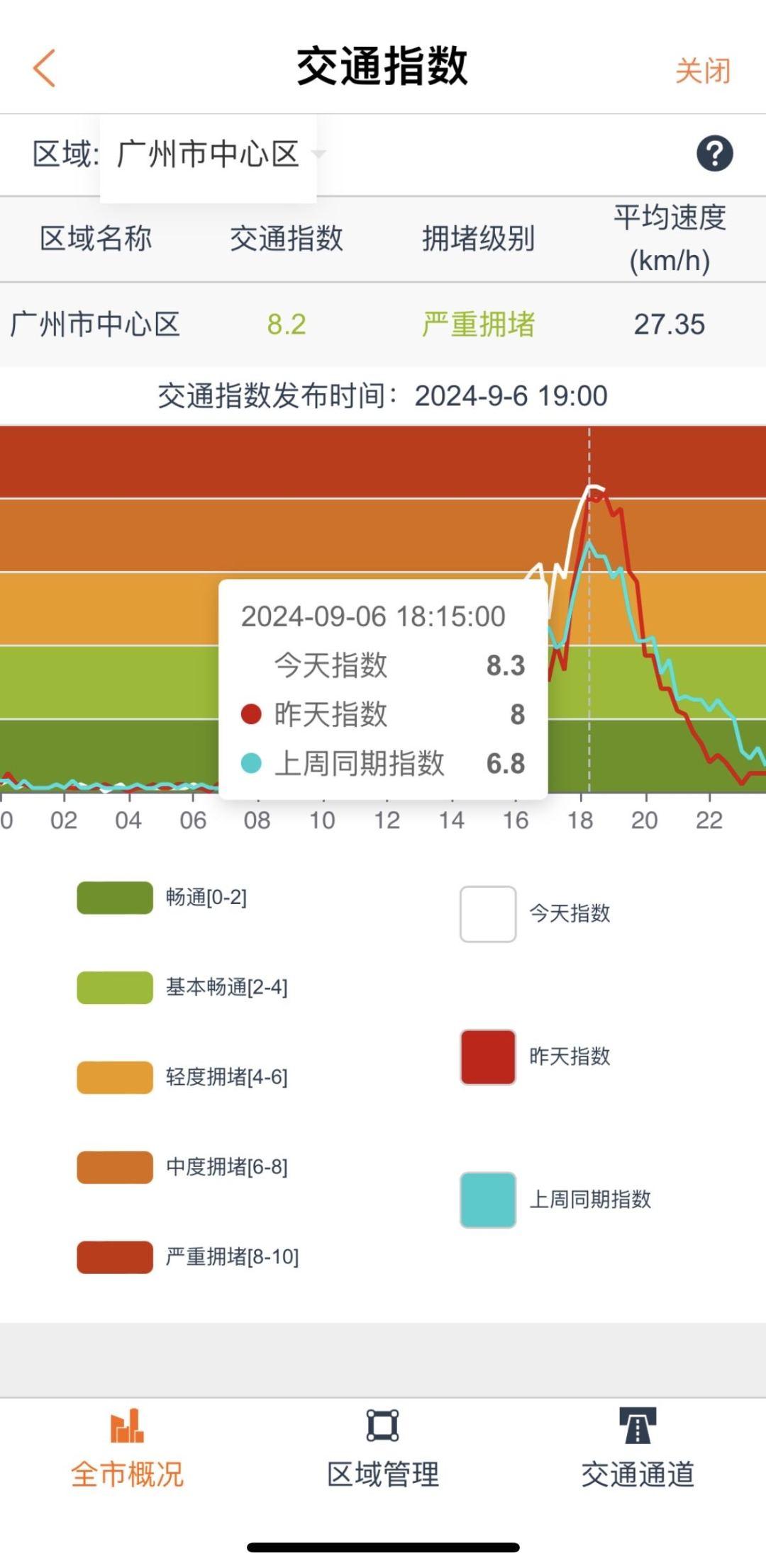 记者从广州交通行讯通了解到,今天18点15分,广州中心区交通指数为8.3,拥堵级别为严重拥堵,昨天同期指数为8拥堵级别为中度拥堵,上周同期则为6.8也是中度拥堵级别。18时30分,广州中心区交通指数保持在8.3,18点45分这一指数为8.2,随后交通指数继续下降。