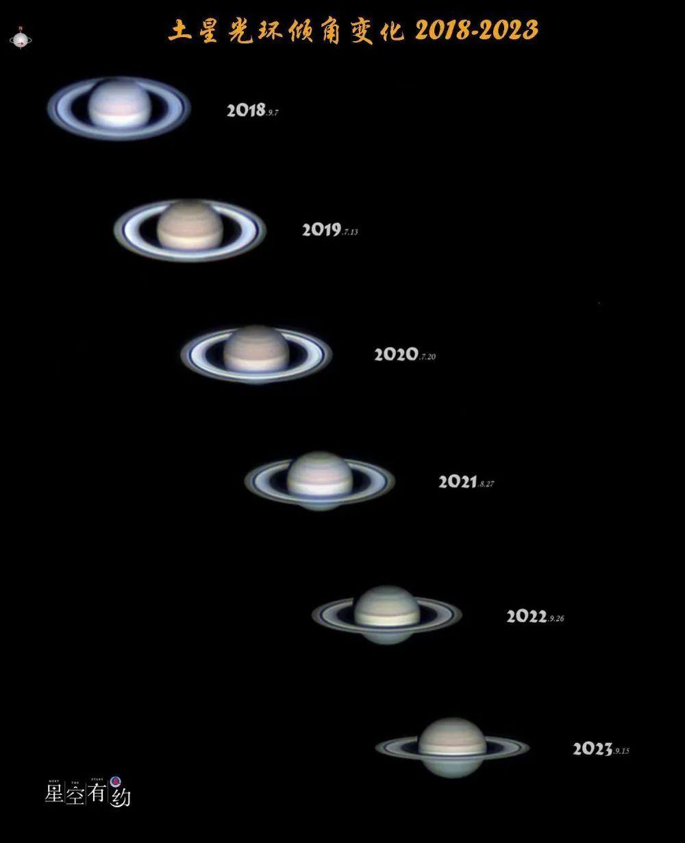 这是连续6年在北京西城拍摄的土星光环倾角变化(拼版)。(星空摄影师王征 摄)