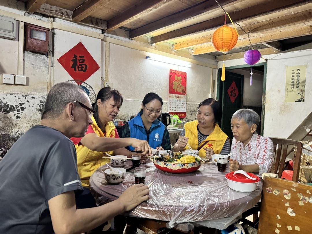 在这个特别的日子里,社工和志愿者们上门陪伴文叔过中秋,并邀请社区内的另外一名孤老玲姨一同到文叔家中共聚团圆。