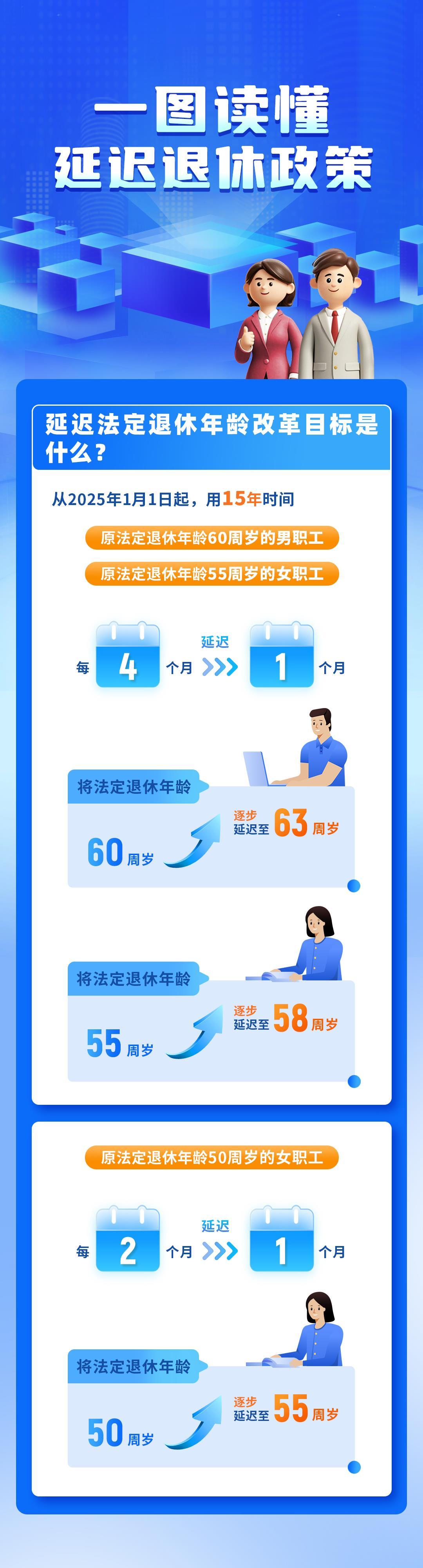 第十四届全国人民代表大会常务委员会第十一次会议通过了《关于实施渐进式延迟法定退休年龄的决定》,本决定自2025年1月1日起施行。男、女职工的法定退休年龄怎样调整?哪些渠道可以查询本人对应的法定退休年龄?弹性延迟退休是怎么规定的?一组图读懂↓↓↓
