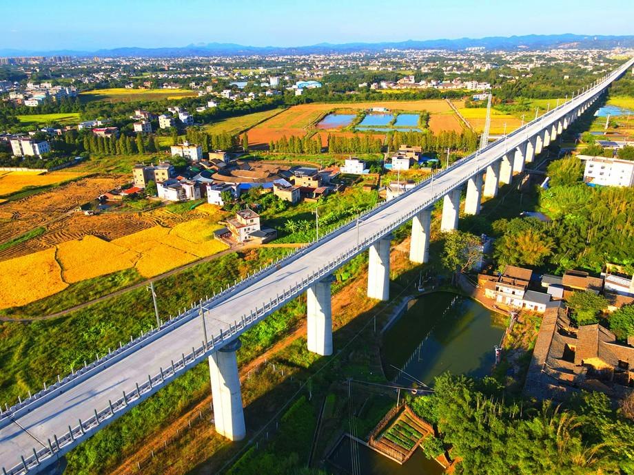 在兴宁市刁坊镇上空俯瞰梅龙高铁宁江特大桥,宛如一条巨龙横卧在田间,成为乡村里一道亮丽风景。宁江特大桥全长4.06公里,上跨漳龙铁路、S225省道,是梅龙高铁全线最长桥梁。
