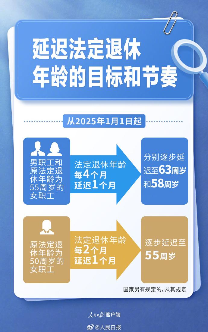 ●从2025年1月1日起,原法定退休年龄60周岁的男职工,法定退休年龄每4个月延迟1个月,逐步延迟至63周岁;原法定退休年龄为55周岁的女职工,法定退休年龄每4个月延迟1个月,逐步延迟至58周岁;原法定退休年龄为50周岁的女职工,法定退休年龄每2个月延迟1个月,逐步延迟至55周岁。