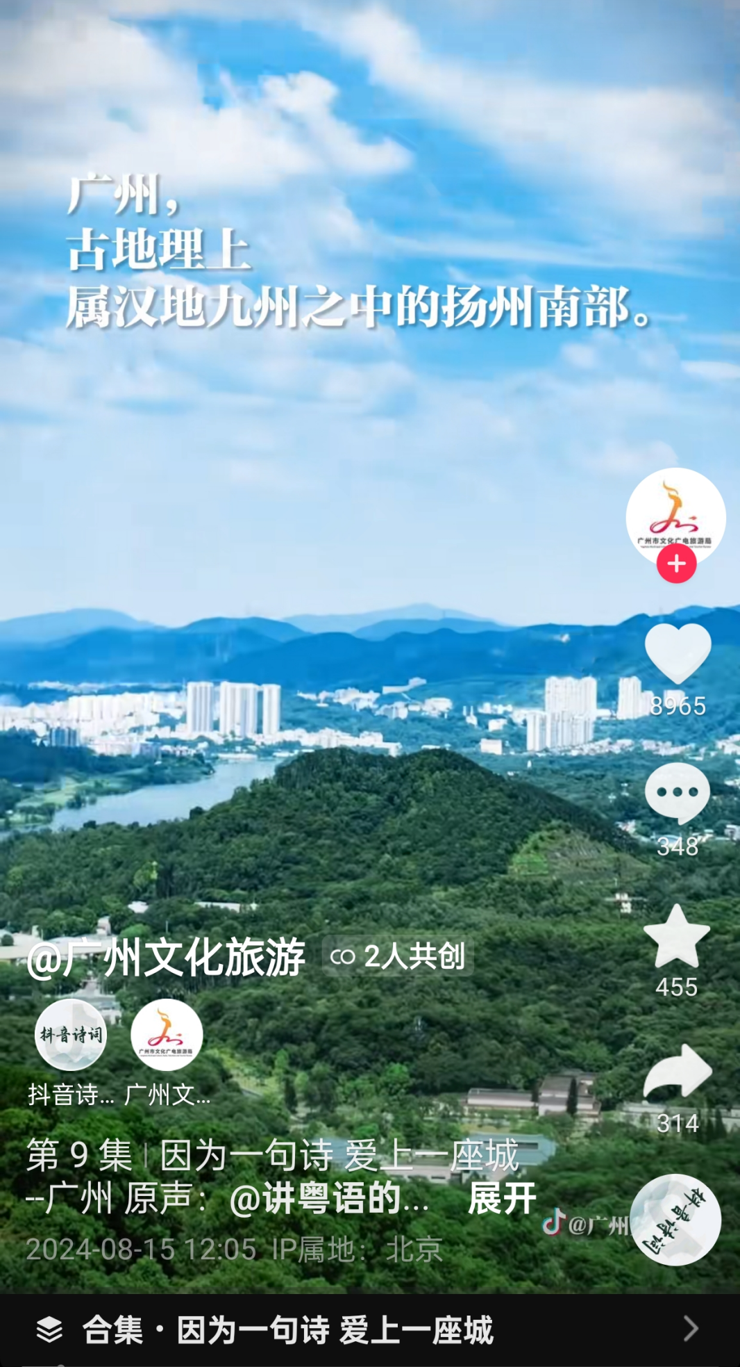 广州文化旅游:与@抖音诗词 发布粤语读唐诗共创视频,创新表达、传播广州城市形象